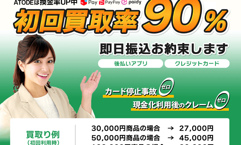 ATODEは、クレジットカードおよび後払いアプリ・キャリア決済を活用した現金化サービスを提供するオンライン専業店です。WEB完結型の申し込みフォームで、顔写真付き身分証や銀行口座を用意すれば来店不要で手続き可能。初回利用者向けに換金率90%台(他社比較で高水準)を打ち出しており、専任スタッフによる丁寧な案内や「カード停止0件」を謳った実績もあります。運営拠点は東京都品川区で、申込は24時間受け付けながら、振込対応は平日営業時間内が基本。全国どこからでもスマホで利用できる点が大きな強みです。
