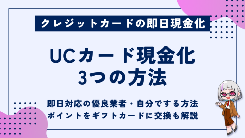 A.できます。UCカードは、業者で現金化・自分で商品を購入して換金・ポイントをギフトカードに交換して換金の3つの方法で現金化できます。